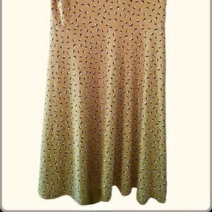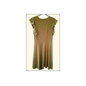 This lovely & elegant Ann Taylor Midi dress shines and flatters in a rich mustard yellow golden hue flow fabric with a black & white abstract dot print. The breezy flutter sleeves and a flattering V-neckline in this dress are stylishly cute, feminine, and classy at the same time, as Ann Taylor always knows what she's doing! The tailored seaming and soft, flow-y, draping fabric strike a feminine silhouette for you, and the versatile style of this dress is great for work or a social outing. Easily dressed up or down with heels, wedges, or flats. It's a versatile all season dress, and can be a go-to for you that's perfect for work, parties, or social outings. Lightweight poly blend fabric.