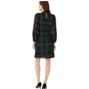 This Ann Taylor dress features a classic green and black plaid pattern, pintuck details, and a flattering A-line silhouette. The long balloon sleeves and mock neck make it perfect for cooler weather, while the fully lined fabric ensures comfort. BELT NOT INCLUDED. Retail $130