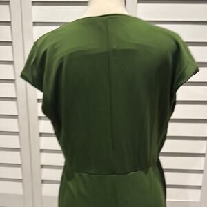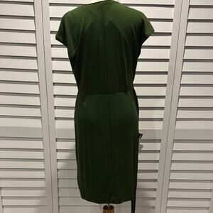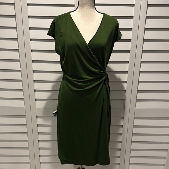 This sophisticated sheath dress in a rich green hue features a flattering wrap design with elegant ruching. The v-neckline and dolman short sleeves add a touch of modern style, making it perfect for both work and cocktail occasions.