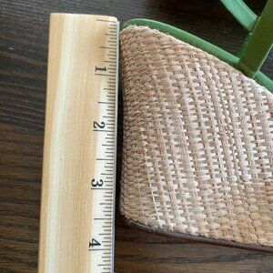 These are adorable Ann Taylor wedges with a unique floral/sunflower design with green leather upper and buckle straps. The only real signs of wear are on the bottom of the shoes, everything else is in excellent condition.