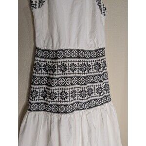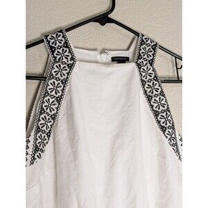 The product is a stylish women's halter dress from Ann Taylor, featuring a floral embroidered design in white and black. Made of lightweight cotton knit fabric, the sleeveless dress has a drop waist and a midi length, making it perfect for spring and summer occasions like parties, travel, or casual outings. The halter neckline and zip closure add a touch of sophistication to this versatile and chic piece, ideal for women who appreciate quality and fashion.