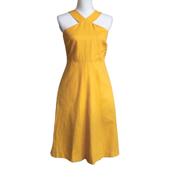 Ann Taylor Halter Midi Dress Mustard Yellow Gold Linen Blend Retro 50s A Line