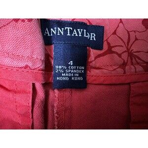 These Ann Taylor Hawaiian Floral Chino Shorts feature a vibrant red and pink floral pattern, perfect for a summer tropical vacation or casual wear. The shorts have a zip closure and a flat front design with a mid-rise waist size of 29 inches. Made of a comfortable blend of spandex and cotton, these size 4 shorts have a 4-inch inseam and slash pockets. The Hawaiian theme adds a fun and stylish touch to the overall design, making them a trendy choice for women's summer fashion.