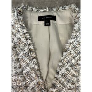 Ann Taylor Ivory Multicolor Plaid Tweed Fringe Jacket Collarless Blazer Size 14