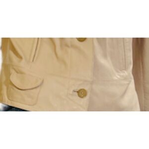 Genuine leather jacket with banded collar. Four button closure and fully lined with impressive details such as a bias-bound pockets and a mini pocket on the lower right side of the jacket. Very good condition (professionally cleaned but neck collar still slightly discolored on inside)| Size: 10 | Color: Cream. Top-rated seller, same-day shipping! Shop my closet for more trendy and vintage items to complement your style.