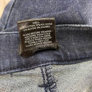 Modern Fit jeans from Ann Taylor: straight leg, cut slim through hip and thigh. Dark blue wash denim with subtle whiskering. Five pocket style with zip and button fly. Mid rise. These jeans have been hemmed, see measurements.
