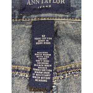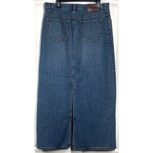 The product is a vintage Ann Taylor Jeans Special Edition denim skirt in a size 12 and a maxi length. It features a solid blue color, a zip closure, and a classic Y2K casual style. Made of 100% cotton denim, this skirt is machine washable and has a vintage appeal with button and zipper accents as well as a back slit and pockets. Perfect for travel or casual occasions in any season, this skirt embodies American, bohemian, and preppy themes, making it a versatile addition to any woman's wardrobe. **Different Brands fit different ways, please check your measurements against the following:** Measurements laying flat: * Waist = 16.5" * Length = 38" * Hip = 21.25" Thank you for shopping with me! :)