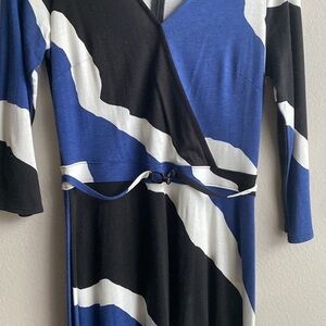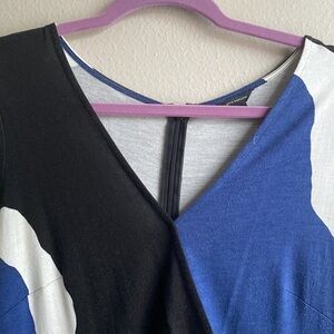 Used Good Condition. Ann Taylor Jersey Eclipse Print Wrap Black Blue Cream Mini Dress size 4 Vneck with snap close crossover front