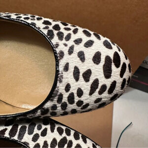 Size 8 Ann Taylor Kamela Wedge Haircalf animal print shoes with a spotted pattern. 3" heel. Genuine leather (haircalf) upper. Some wear on the soles.