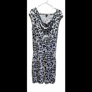 This is an Ann Taylor knit dress in size XS with a floral navy flower print on an ivory background. It is a sleeveless midi dress with a cowl neck and a blouson style. The fabric type is knit, suitable for summer and spring seasons.