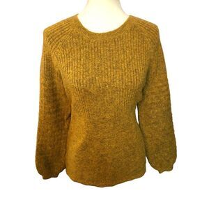 Ann Taylor Knit Sweater Bubble Sleeve Wool Blend Ribbed Mustard Yellow.  Balloon sleeves, crew neck ribbed and waffle textures.
