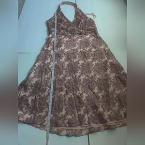 Keywords: silk, natural material, paisley, ruched waistline, midi, maxi, Pink Salmon, coral, mauve, halter, special occasion, wedding guest, floral, boho, Bohemian, cocktail dress, semi-formal, hoco, homecoming, prom, quiet luxury,
