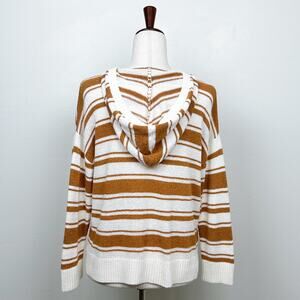 Size Small Ann Taylor LOFT hooded pullover. Wide striped knit fabric. Orange/rust/brown and cream colors. V-neckline. Side vents. No flaws, excellent condition!