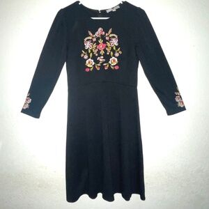 EUC with no flaws. This is a great looking dress with some cool floral embroidery in bright shades of pink yellow and white.accents on the front and the sleeves. A-Line . long sleeve , crewneck. Back zipper closure. Classic style for work or going out. 69% Rayon 29% polyester 2% spandex. Lining 100% polyester Size 4 Flat lay measurements are listed and are approximate.