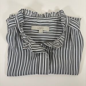 This elegant sleeveless blouse from LOFT features a chic mandarin collar and stylish ruffled details. The white and black color palette adds a touch of sophistication, while the tie front design offers a modern twist. Perfect for both casual and professional settings, this blouse is a versatile addition to any wardrobe. New without tags