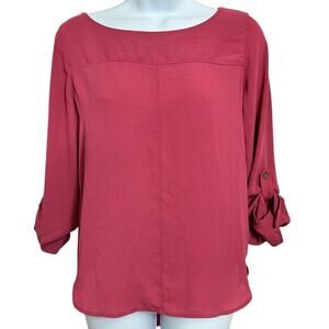 Ann Taylor LOFT Blouse Sz S Petite Rosy Pink Long Roll Tab Sleeves Career Office