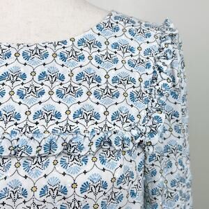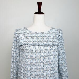 Size Medium Ann Taylor LOFT Long Sleeve Blouse. Printed blue clip dot fabric. Loose fit, Ruffle detail around the yoke. Keyhole button back closure. Great condition!