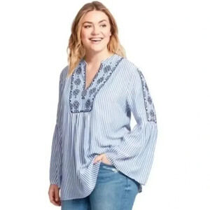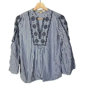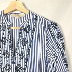 Ann Taylor LOFT Blue & White Stripe Embroidered Bell Sleeve Long Sleeve