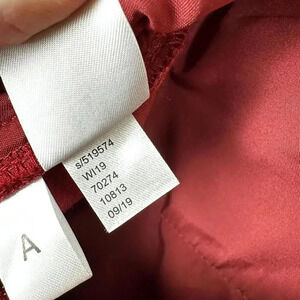 Burgundy, red, wine, maroon colored straight leg trouser with gold button tailor detailing at belt loops.