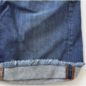 These Ann Taylor LOFT Denim Bermuda Shorts in Classic Dark Indigo Wash, size 6, feature a modern fit with rolled cuffs and contrast topstitching. Made of a cotton blend denim fabric, they have a high waist and a Bermuda length inseam. Perfect for travel or casual wear, they have signature hardware, front zip with button closure, belt loops, and five-pocket styling, with unfinished cuffs when unrolled for a versatile look.