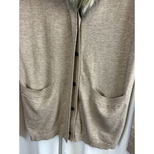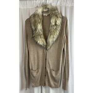 Elevate your wardrobe with this stunning Ann Taylor LOFT cardigan! The elegant tan color and classic design make it perfect for any occasion, whether it's a party, workwear, or a casual day out. The faux fur collar adds a touch of glamour and the button accents give it a preppy vibe.