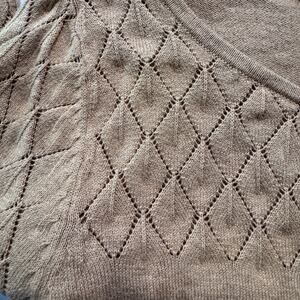 Lightweight tan cotton sweater by Ann Taylor LOFT Factory. Wide scoop neckline, ¾ sleeves, diamond-knit pattern at top and sleeves. Soft, breathable, and perfect for layering.