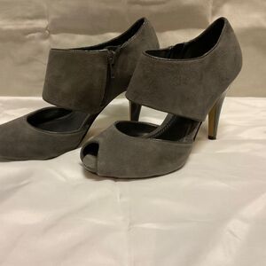 Super cute suede gunmetal grey open toe bootie. Inside zip.