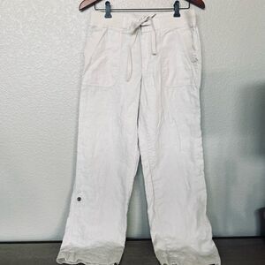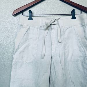 Women’s size 6 Ann Taylor LOFT lounge light cream beige off white linen pants with roll-up lower hem for cropped look. Can be unrolled for full length. Stretch drawstring waist. Great preowned condition, no flaws, clean nonsmoking home. Approx 16” across waist, 29” inseam, 8.5” rise.