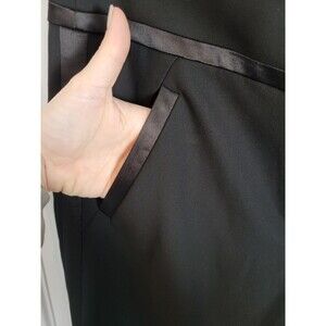 Features: Zipper/clasp front closure. Four pockets. Satin trim.