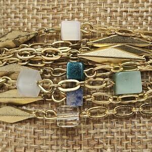 Ann Taylor LOFT gold tone multi chain bracelet with teal green and blue square glass beads, toggle closure. Signed Fashion Jewelry Statement Boho Indie Layered Workwear