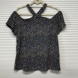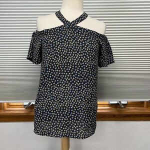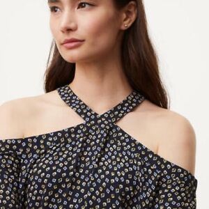 NWT Ann Taylor LOFT Blue Diamond patterned Flounce Cold off the Shoulder Top with a keyhole back