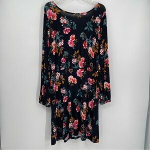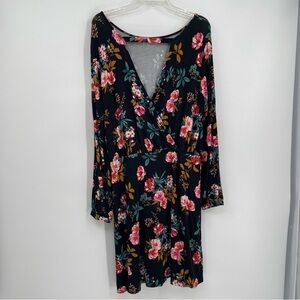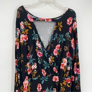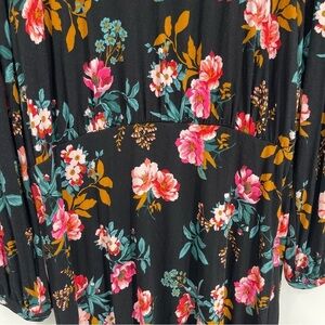 Ann Taylor LOFT NWT Women Black Floral Dress Size 14 Deep-v Back Long Sleeves. Rayon spandex. Pullover with side zip. Small pleats at waistline. Button cuffs. Black with multicolor floral pattern. Bust 48. Length 45. Measurements are approximate. New.