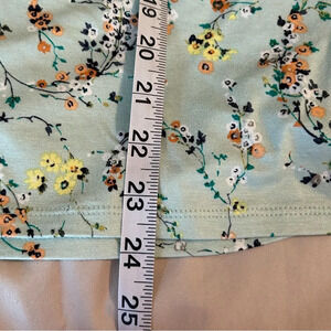 Mint blue green short flutter sleeve top with ditsy floral print. Had v neckline and slight slit at bottom hem. Made of 95% rayon and 5% spandex. Machine washable.