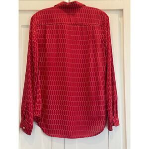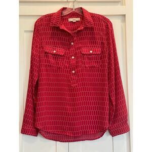 in excellent condition. flowy and eye-catching. Perfect for office or a date night. pairs well with suits or jeans and heels. Collared, with 5 button closure on top half. Long Sleeves have adjustable roll tabs and button cuffs . 2 front button chest pockets. rounded shirt tail hem