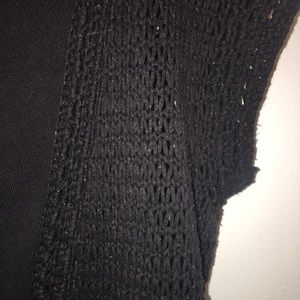 Black, stretchy material, high neck tank top with a shirt sleeve, sparkly, tie up sweater.