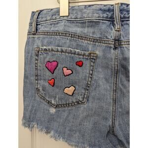 LOFT Ann Taylor Womens Size 10 Shorts Denim Cut Off Embroidered Upcycled. In great preloved condition. Hearts and the word love have been sewn on to the back pockets.