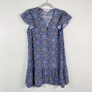 Women's Ann Taylor LOFT blue/pink medallion button ruffle flounce dress