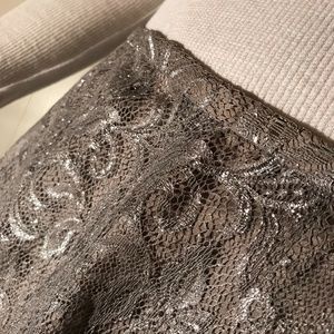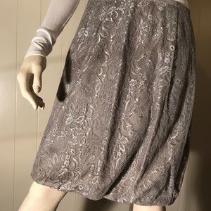Metallic silver lace, bubble skirt with side zip and hook/eye closure. Lined and in beautiful condition.
