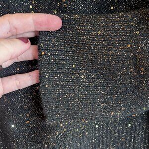 LOFT Sweater Size Large. Deep brown color. Fabric can appear Black depending on what you wear with it, but definitely is deep brown. Fabric is embedded with metallic sparkled yarn. Also has sequins attached to the surface of the sweater. Ribbing at shoulders gives a boat-neck appearance, even though it's a standard crew-neck sweater. Item is in excellent condition. No pulled sparkles or missing sequins.
