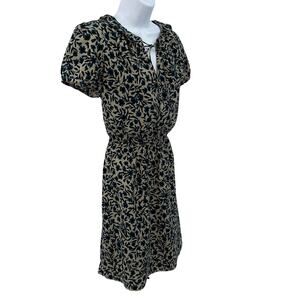Women's Mini Floral Dress by Ann Taylor LOFT, Us Size Medium, Tan/Blue/Black in Color with floral print, Short Dress, Crew neckline, Ruffle neck, Tie Closure, Stretchy waist, Short Sleeve, Pullover, Lined, Mini Dress, Casual, Party, Office. Work, Everyday Dress.