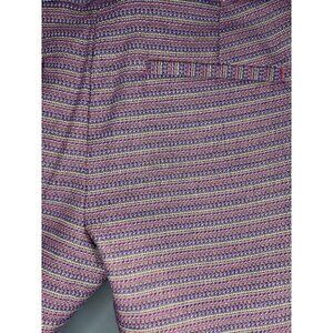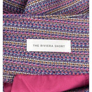 These Ann Taylor LOFT The Riviera Shorts are a stylish and versatile piece for women in size 4. Made of a comfortable knit fabric with a striped pattern in pink, it features a mid-rise fit with a zip closure and a 3.5-inch inseam. Ideal for casual, workwear, or travel occasions during the summer and spring seasons, this chino-style short boasts easy care, stretch, breathability, and lightweight feel. The design is accentuated with a zipper detail, belt loops, and slash pockets, embodying a preppy and colorful theme perfect for various fashion preferences.