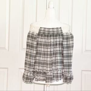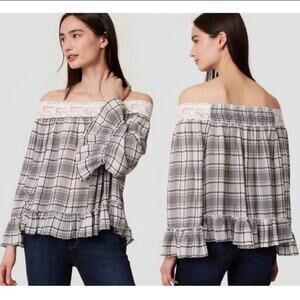 Ann Taylor LOFT Plaid Lace Off The Shoulder Blouse Top
