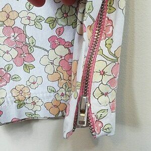 Vintage inspired pastel floral print in shades of pink, peach, green and light yellow on a white background. Zipper side pockets. Zipper detail at ankles.