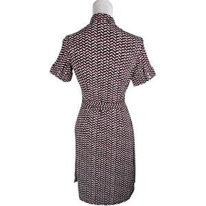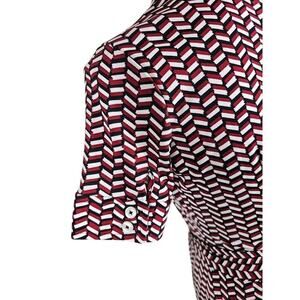 The Ann Taylor LOFT red and white short sleeve V-neck wrap dress in woman's size 6 petite is a versatile and stylish addition to any wardrobe. Made from polyester fabric with stretch, this knee-length dress features a tie closure and a geometric pattern. Perfect for casual outings, workwear, or business meetings, this wrap dress is designed for comfort and style. The classic and colorful theme makes it a great choice for the summer, fall, and spring seasons, adding a touch of personality with its unique accents. Easy to care for with machine washable instructions, this dress is a must-have for petite women looking for a flattering and fashionable option.
