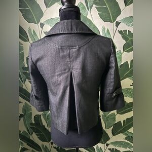 Excellent used condition. Pet to pet measures approximately 17.5 inches across front. Length measures approximately 17 inches from shoulder to hem. Light shoulder padding. Cropped length.
