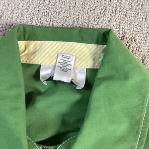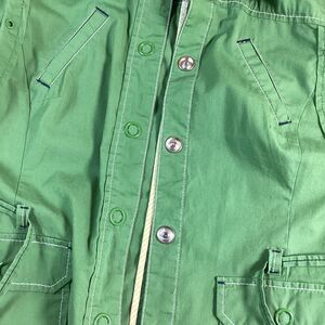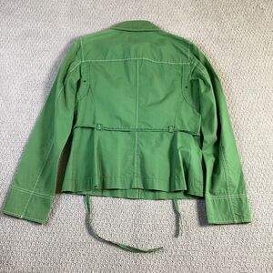 This Ann Taylor LOFT green utility jacket is a stylish and versatile outerwear piece for spring or fall. It features a button-up front with silver snaps, front slit pockets, drawstring waist detail, and white contrast stitching. Size 0 (see measurements below for fit accuracy).