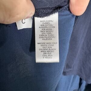 Women's chiffon back t-shirt by Ann Taylor LOFT. This navy blue boho top has a jersey knit front with a round collar and short sleeves and a chiffon panel back. It is a cotton modal blend front and a 100% polyester back.