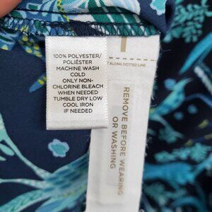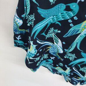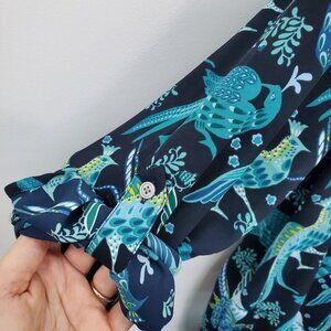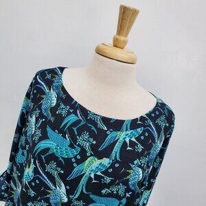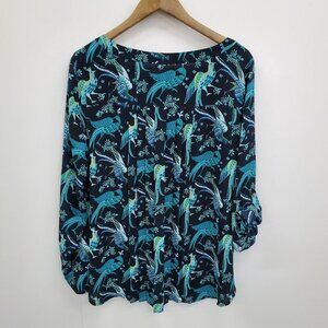 Ann Taylor LOFT Womens Peacock Tunic Top Size L Blue Roll Tab Sleeve Birds