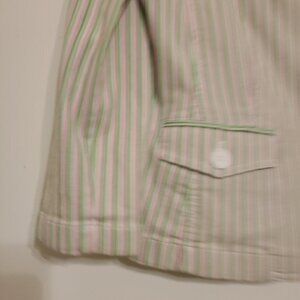 Women's retro, pink and green striped blazer jacket by Ann Taylor Loft, size 6. Blazer is lightweight with three buttons down the front with three button pockets. Cotton and lycra blend fabric; slightly stretchy. Excellent pre-owned condition; no flaws.