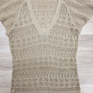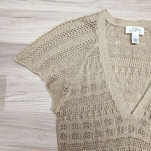 Ann Taylor LOFT Womens Tan Open Crochet V-neckline Blouse Flutter Sleeves Small